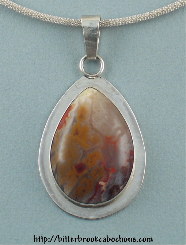 I still have a few slabs of Alabama Paint Rock, from Paint Rock, Alabama! This big teardrop has the reddest reds I've seen in Paint Rock yet; too bad there's so little of it. Almost the entire right side of the cabochon is opaque; has lots of yellow and some bright white spots, too. 36mm x 26mm x 8mm. Weight: 54.60 carats. Every one of my cabochons is custom cut to take the best advantage of the particular slab from which it is fashioned. Colors may vary somewhat from what is pictured due to differences in computer monitors. Click the image on the right to see the cabochon super-sized... |