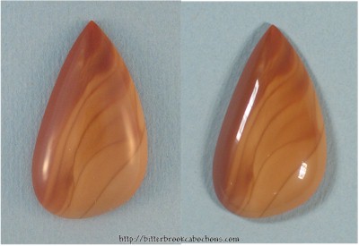 Here's a sweet designer cut Bruneau Jasper what would make a nice pendant. Soft & dark on the left, muted layers on the right. Very nice! Gloria at Wire Treasures wire wrapped this cab into a pendant; you can see it here! 38mm x 22mm x 6.5mm. Weight: 34.05 carats. Every one of my cabochons is custom cut to take the best advantage of the particular slab from which it is fashioned. Colors may vary somewhat from what is pictured due to differences in computer monitors. Click the image on the right to see the cabochon super-sized... Do you like Bruneau Jaspers? Click here to see all of the Bruneau Jaspers on the site! |
