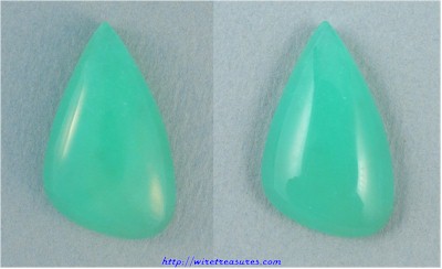 Here's a pale green Chrysoprase designer cabochon with NO dark blemishes. It has a few lighter specks inside, but unless you have broght backlighting, you can't see them. Gloria at Wire Treasures is going to transform this cab into a pendant. 26mm x 16mm x 6mm. Weight: 16.70 carats. Every one of my cabochons is custom cut to take the best advantage of the particular slab from which it is fashioned. Colors may vary somewhat from what is pictured due to differences in computer monitors. Click the image on the right to see the cabochon super-sized... |