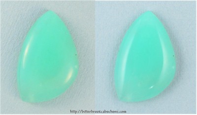 Soothing, almost perfect green Chrysoprase designer cabochon, cut in parrot-bill shape. This can gets a teeny bit lighter at the very bottom and has two tiny dark spots (one is shown in the photo, the other is not visible from the front). Spots will likely both be hidden by a border wire wrap. It's so hard to find good Chrysoprase, and this one is a real beauty! 33mm x 21mm x 6mm. Weight: 33.20 carats. Every one of my cabochons is custom cut to take the best advantage of the particular slab from which it is fashioned. Colors may vary somewhat from what is pictured due to differences in computer monitors. Click the image on the right to see the cabochon super-sized... |