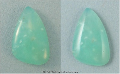 Here's a nice small Chrysoprase cabochon. It's a very light green tint with several milky inclusions. Has a few surface imperfections where the inclusions are at the surface, but very, very small. 28mm x 17mm x 5.5mm. Weight: 19.85 carats. Every one of my cabochons is custom cut to take the best advantage of the particular slab from which it is fashioned. Colors may vary somewhat from what is pictured due to differences in computer monitors. Click the image on the right to see the cabochon super-sized... |