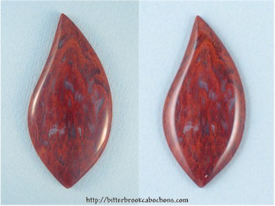 The photos do not do this cabochon justice! You can see around the flames as you turn the cab and look into it. What a beauty! 57mm x 27mm x 5.5mm. Weight: 59.60 carats. Every one of my cabochons is custom cut to take the best advantage of the particular slab from which it is fashioned. Colors may vary somewhat from what is pictured due to differences in computer monitors. Click the image on the right to see the cabochon super-sized... |
