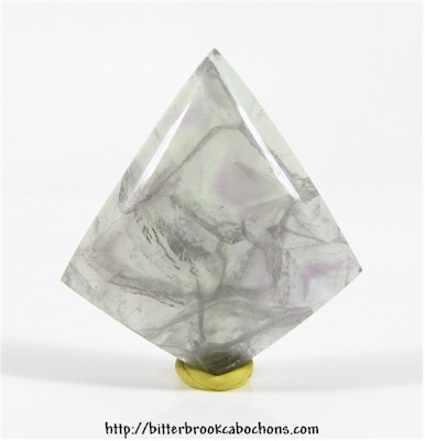 I bought this Fluorite rough on a lark; I was curious to see if I could cut cabochons from it. And I did! It was "fun" to cut; I got lots of suds while cutting it, and it cut so quickly that I was surprised at how easily it took a polish! This cab is cut in a lopsided arrowhead shape; it has lots of inclusions and a very pale green hue. 36.5mm x 33mm x 8mm. Weight: 63.80 carats. Every one of my cabochons is custom cut to take the best advantage of the particular slab from which it is fashioned. Colors may vary somewhat from what is pictured due to differences in computer monitors. Click the image on the right to see the cabochon super-sized... |