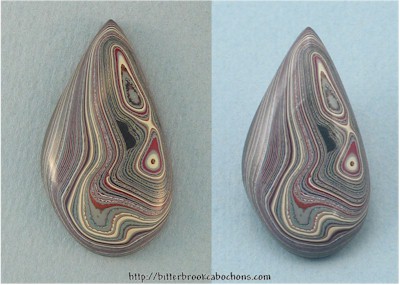 Wild and crazy paint swirls on this freeform cut Fordite cabochon! The black part isn't a hole, but an area of flat black paint. Active and exciting! 32mm x 17mm x 5mm. Weight: 11.70 carats. Every one of my cabochons is custom cut to take the best advantage of the particular slab from which it is fashioned. Colors may vary somewhat from what is pictured due to differences in computer monitors. Click the image on the right to see the cabochon super-sized... |