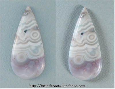 Big teardrop shaped Laguna Agate. Pretty lace & orbs as well as a purple tint at the bottom. A real beauty!