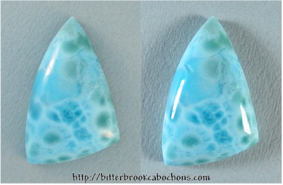 Absolutely incredible Larimar designer cabochon! If you look at this cab, it looks as though the colors are boiling! The larger blobs around the periphery of this cab are a green-blue (not easy to see in this photo). 41mm x 26mm x 8mm. Weight: 58.90 carats. Every one of my cabochons is custom cut to take the best advantage of the particular slab from which it is fashioned. Colors may vary somewhat from what is pictured due to differences in computer monitors. Click the image on the right to see the cabochon super-sized... |