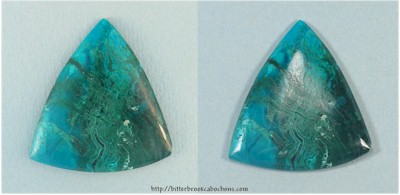 Pretty, pretty, pretty! This Malachite & Azurite pendant looks terrific in daylight. It has a black streak of lightning crashing right down its middle! 36mm x 33mm x 4.5mm. Weight: 40.30 carats. Every one of my cabochons is custom cut to take the best advantage of the particular slab from which it is fashioned. Colors may vary somewhat from what is pictured due to differences in computer monitors. Click the image on the right to see the cabochon super-sized... |