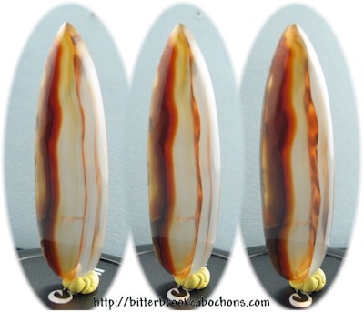 This long Montana Agate teardrop has a spectacular pattern! Several long dark inclusions run parallel, top to bottom, at an angle from the plane of the back. See the extra images to see how the appearance changes as the cab is rotated. The fracture towards the bottom is stable. Buy this one fast before I decide to keep it for my collection! 57mm x 16mm x 6mm. Weight: 50.10 carats. Every one of my cabochons is custom cut to take the best advantage of the particular slab from which it is fashioned. Colors may vary somewhat from what is pictured due to differences in computer monitors. Click the image on the right to see the cabochon super-sized... Do you like Montana Agates? Click here to see all of the Montana Agates on the site! |