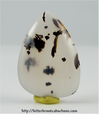 Nice fracture-free Montana Agate freeform cabochon! Slightly milky background with little black inclusions. Very pretty! 26mm x 18.5mm x 5mm; cab has a flat girdle. Weight: 17.35 carats. Every one of my cabochons is custom cut to take the best advantage of the particular slab from which it is fashioned. Colors may vary somewhat from what is pictured due to differences in computer monitors. Click the image on the right to see the cabochon super-sized... Do you like Montana Agates? Click here to see all of the Montana Agates on the site! |
