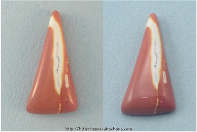 Reeeeally thin Mook Jasper cabochon! But not too thin for a bold white stripe down the middle... 31mm x 15mm x 6mm. Weight: 16.95 carats. Every one of my cabochons is custom cut to take the best advantage of the particular slab from which it is fashioned. Colors may vary somewhat from what is pictured due to differences in computer monitors. Click the image on the right to see the cabochon super-sized... Do you like Mook Jaspers? Click here to see all of the Mook Jaspers on the site! |