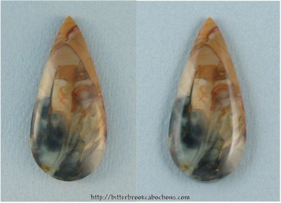 Gorgeous Morrisonite cab! It has a fracture at lower left which has been stabilized and is more difficult to see in person. 41mm x 19mm x 5mm. Weight: 29.40 carats. Every one of my cabochons is custom cut to take the best advantage of the particular slab from which it is fashioned. Colors may vary somewhat from what is pictured due to differences in computer monitors. Click the image on the right to see the cabochon super-sized... |