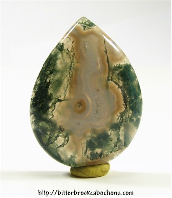 This is a great looking Moss Agate cabochon! Delicate green moss throughout, in an almost clear matrix. Front & center is a large druzy inclusion with an "eye" in it. The druzy has several vugs of different sizes. I added a second photo so you could see all! 40mm x 30mm x 6mm. Weight: 52.25 carats. Every one of my cabochons is custom cut to take the best advantage of the particular slab from which it is fashioned. Colors may vary somewhat from what is pictured due to differences in computer monitors. Click the image on the right to see the cabochon super-sized... |