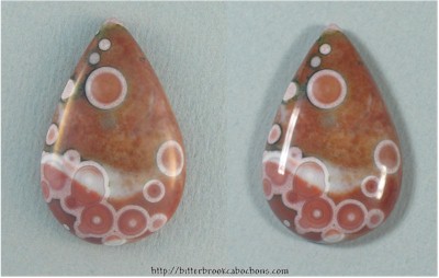 Sweet Ocean Jasper! Nicely defined white orbs with pink centers, and an unusual white wave that goes through orbs! 33mm x 21mm x 6mm. Weight: 28.65 carats. Every one of my cabochons is custom cut to take the best advantage of the particular slab from which it is fashioned. Colors may vary somewhat from what is pictured due to differences in computer monitors. Click the image on the right to see the cabochon super-sized... Do you like Ocean Jaspers? Click here to see all of the Ocean Jaspers on the site! |