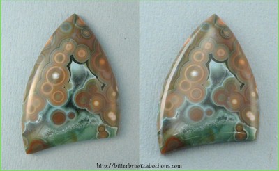 BIG Ocean Jasper cabochon! Honey-colored orbs with green outlines floating in an almost translucent sea of green. Has a really neat "shadow" effect behind the obs on top. A very striking and BIG designer cabochon! 47mm x 34mm x 5.5mm. Weight: 66.55 carats. Click the image on the right to see the cabochon super-sized... |