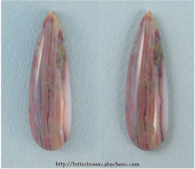 Long & lean Ocean Wave teardrop shaped cabochon! This one is on the thick side, you wire wrappers. You'll be able to go crazy with the wire; this cab will take all the wire you want! 38mm x 11mm x 6mm. Weight: 19.75 carats. Every one of my cabochons is custom cut to take the best advantage of the particular slab from which it is fashioned. Colors may vary somewhat from what is pictured due to differences in computer monitors. Click the image on the right to see the cabochon super-sized... |