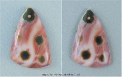This Ocean Wave cab was fun to cut! While shaping it, I watched the pale green orb on the left disappear, and the white areas grow slowly around the orbs at the bottom. None of these orbs is visible on the back side, so they are just barely present in the rock. Very cool cabochon! 43mm x 28mm x 7mm. Weight: 56.35 carats. Every one of my cabochons is custom cut to take the best advantage of the particular slab from which it is fashioned. Colors may vary somewhat from what is pictured due to differences in computer monitors. Click the image on the right to see the cabochon super-sized... |