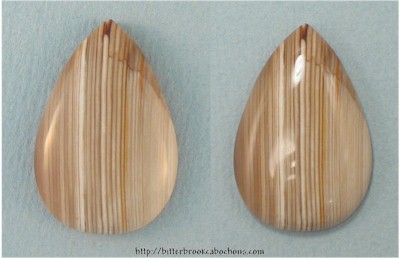 Pretty uniform layers in this Petrified Wood teardrop. There is a coloration on the top of the cabochon that actually looks a like a pre-petrification water stain! 28mm x 18mm x 5mm. Weight: 18.20 carats. Every one of my cabochons is custom cut to take the best advantage of the particular slab from which it is fashioned. Colors may vary somewhat from what is pictured due to differences in computer monitors. Click the image on the right to see the cabochon super-sized... Do you like Petrified Woods? Click here to see all of the Petrified Woods on the site! |
