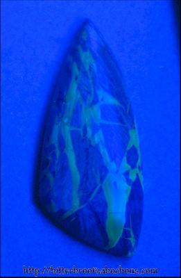 This giant cabochon is absolutely spectacular! It looks like shards of gray glass in a clear matrix. It's hard to tell from the photo, but every line that looks wider than an "eentz" is a clear space between the "shards." Plus, (you're going to love this) these clear spaces fluoresce a bright green under short-wave UV! The rest of the cab floresces a pale yellow under long-wave UV. See the second photo. I'm not certain of the identification, but it appears like an opalized piece of Petrified Wood. If I'm wrong please let me know. 59mm x 26mm x 7mm. Weight: 76.80 carats. Every one of my cabochons is custom cut to take the best advantage of the particular slab from which it is fashioned. Colors may vary somewhat from what is pictured due to differences in computer monitors. Click the image on the right to see the cabochon super-sized... Do you like Opalized Petrified Woods? Click here to see all of the Opalized Petrified Woods on the site! |