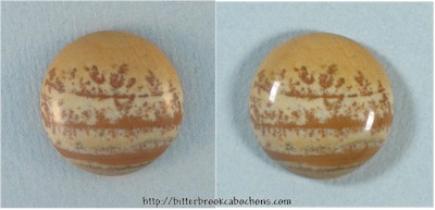 Little circle of Picture Jasper. Muted patterns of trees under a soft gold sky. 18mm diameter x 6mm. Weight: 15.35 carats. Every one of my cabochons is custom cut to take the best advantage of the particular slab from which it is fashioned. Colors may vary somewhat from what is pictured due to differences in computer monitors. Click the image on the right to see the cabochon super-sized... Do you like Picture Jaspers? Click here to see all of the Picture Jaspers on the site! |