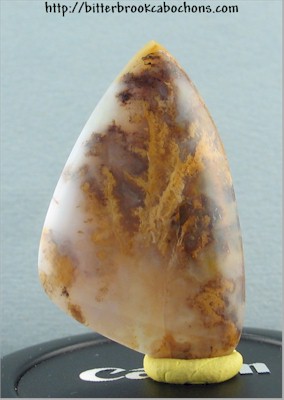 Very nice plumes in this freeform-cut Plume Agate cabochon. Gloden plumes against a milky white background. VERY nice. 40mm x 25mm x 6mm. Weight: 42.95 carats. Every one of my cabochons is custom cut to take the best advantage of the particular slab from which it is fashioned. Colors may vary somewhat from what is pictured due to differences in computer monitors. Click the image on the right to see the cabochon super-sized... |