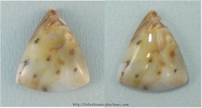 This little Polkadot Jasper triangle has a wavy background and a hint of polkadots. A real cutie! 25mm x 22mm x 7mm. Weight: 23.90 carats. Every one of my cabochons is custom cut to take the best advantage of the particular slab from which it is fashioned. Colors may vary somewhat from what is pictured due to differences in computer monitors. Click the image on the right to see the cabochon super-sized... |