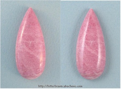 Big, weighty Rhodonite teardrop! For those of you who like your Rhodonite pink, this one has NO black anywhere. The back of the cab has saw marks, but the "money" side of this cabochon is pink and pretty! 45mm x 19mm x 9mm. Weight: 80.40 carats. Every one of my cabochons is custom cut to take the best advantage of the particular slab from which it is fashioned. Colors may vary somewhat from what is pictured due to differences in computer monitors. Click the image on the right to see the cabochon super-sized... Do you like Rhodonite Cabochons? Click here to see all of the Rhodonite Cabochons on the site! |