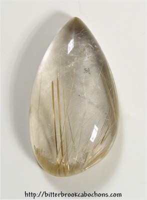This Rutilated Quartz cabochon has a small group of bold Rutile at the forefront with smaller bundles on the right. Cab has a rounded girdle. 29mm x 16.5mm x 8mm. Weight: 27.95 carats. Every one of my cabochons is custom cut to take the best advantage of the particular slab from which it is fashioned. Colors may vary somewhat from what is pictured due to differences in computer monitors. Click the image on the right to see the cabochon super-sized... |