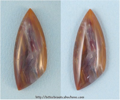 There aren't many pretty rocks native to Alabama, but this Seam Agate is one of them. Milky waves with a hint of red are sandwiched between golden waves at the edges. There is a fracture on the left edge that is not visible from the front. 43mm x 18mm x 7mm. Weight: 39.00 carats. Every one of my cabochons is custom cut to take the best advantage of the particular slab from which it is fashioned. Colors may vary somewhat from what is pictured due to differences in computer monitors. Click the image on the right to see the cabochon super-sized... |