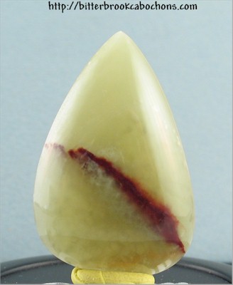 Some time in the past, this piece of Soapstone developed a red slash through it. This cabochon is a bit cloudy, but still looks great. And what a polish! 36mm x 23.5mm x 7mm. Weight: 45.65 carats. Every one of my cabochons is custom cut to take the best advantage of the particular slab from which it is fashioned. Colors may vary somewhat from what is pictured due to differences in computer monitors. Click the image on the right to see the cabochon super-sized... Do you like Soapstones? Click here to see all of the Soapstones on the site! |