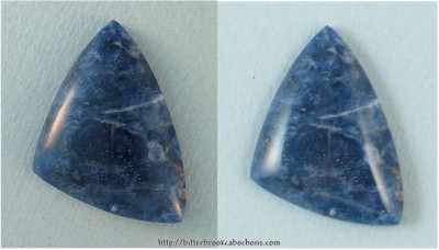 Here's a smallish Sodalite triangular cut cabochon. Lots of very small whitish markings, almost looks like snow flurries over most of the cab. 30mm x 21mm x 6mm. Weight: 20.45 carats. Every one of my cabochons is custom cut to take the best advantage of the particular slab from which it is fashioned. Colors may vary somewhat from what is pictured due to differences in computer monitors. Click the image on the right to see the cabochon super-sized... |