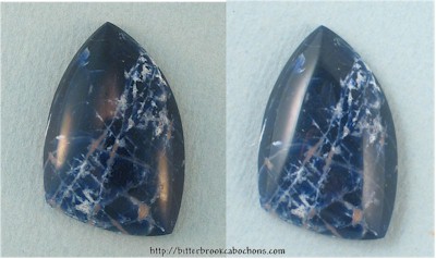 Nice dark blue Sodalite cab! Has some well-defined white streaks and looks terrific overall. 27mm x 17mm x 6mm. Weight: 18.10 carats. Every one of my cabochons is custom cut to take the best advantage of the particular slab from which it is fashioned. Colors may vary somewhat from what is pictured due to differences in computer monitors. Click the image on the right to see the cabochon super-sized... |
