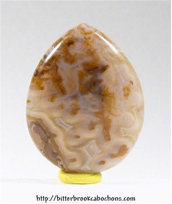 Here's a nice selection of Tube Agate, cut into a fat teardrop shape. The "tubes" slice through the cab right to left, top to bottom, and can easily be seen all over the cabochon. A very pretty cabochon as well. 33mm x 26mm x 5mm. Weight: 33.95 carats. Every one of my cabochons is custom cut to take the best advantage of the particular slab from which it is fashioned. Colors may vary somewhat from what is pictured due to differences in computer monitors. Click the image on the right to see the cabochon super-sized... |
