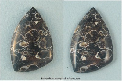 Nice fracture-free Turritella specimen! Several of the little fossils are filled with a natural clear rock. Gloria at Wire Treasures wire wrapped this cab into a pendant; you can see it here! 35mm x 23mm x 5mm. Weight: 32.00 carats. Every one of my cabochons is custom cut to take the best advantage of the particular slab from which it is fashioned. Colors may vary somewhat from what is pictured due to differences in computer monitors. Click the image on the right to see the cabochon super-sized... |